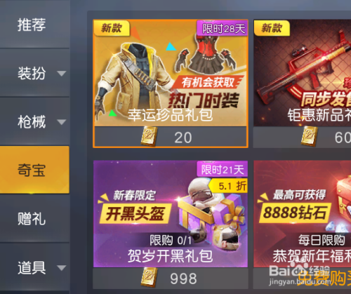 我们打开商城之后,左侧会有一个奇宝页面,这个页面里的工具根基上都是抽奖的物品,我们可以点开这些工具,看看里面的奖励,选择一个来进行采办。