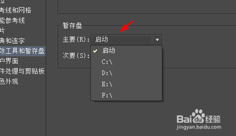 接着进入首选的界面,找到增效东西和暂存盘,如下图所示: