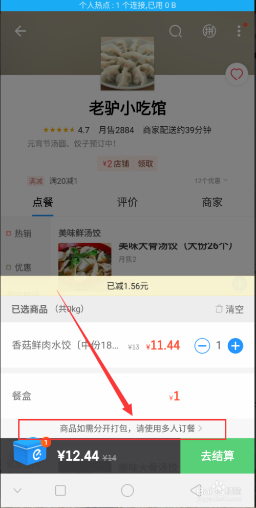 接着点击弹出的页面底部的【商品如需分隔打包,请利用多人订餐】。