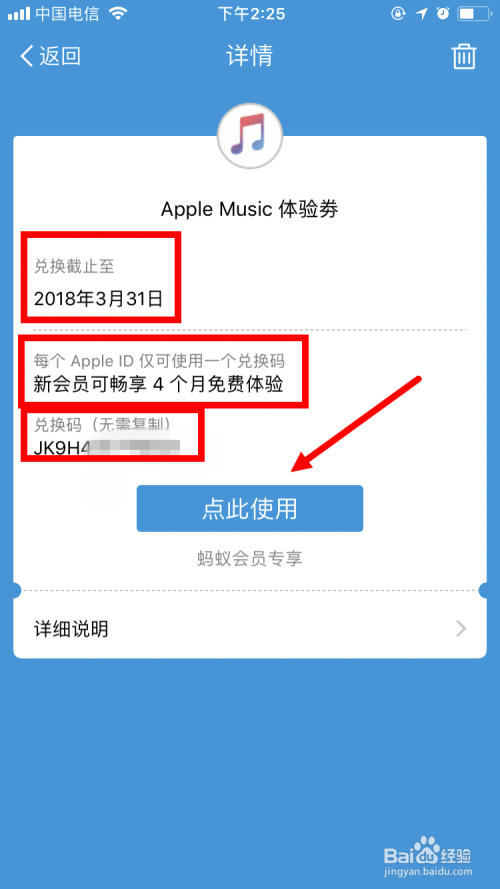 进入详情页面,可以看到“兑换截止至2018年3月31日”、新会员是四个月的免费体验以及“兑换码”(无需复制),然后点“点此利用”。