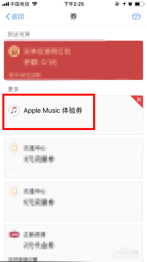 这时会直接进入付出宝的卡包,在里面找到“Apple Music体验券”,并点击。
