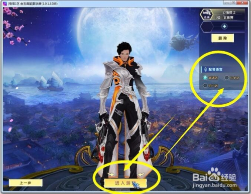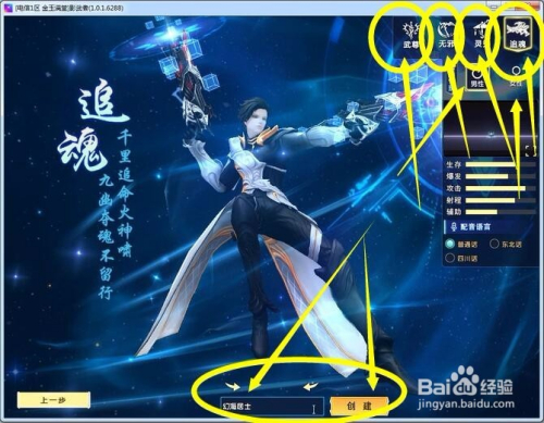 注册游戏人物性别、职业、名字等属性。职业分为武尊、吴邪、灵秀和追魂。小编选择射手性质的追魂。