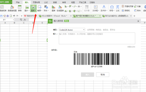 在“插入”菜单栏中,找到图库选择,在图库的拉下选项中你阿谁找到条形码