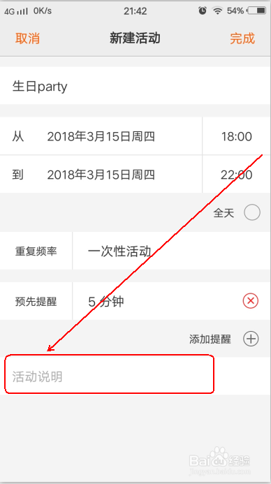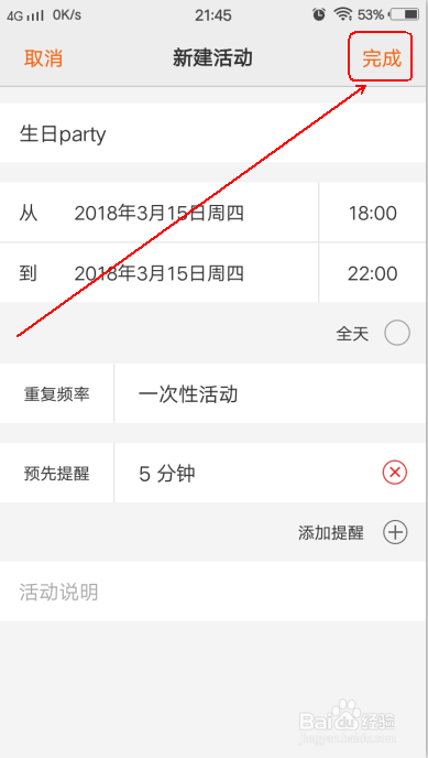 最后,填写“活动申明”(可以不填),点击右上角“完当作”就行了。