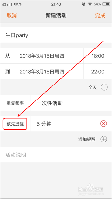 然后设置“预先提醒”的时候。