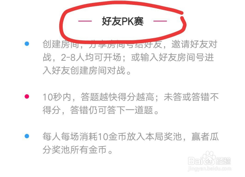 第三种弄法是老友PK赛,这种就是建立好房间,邀请本身的老友介入进来玩答题游戏,每场每人耗损10个金币翻入奖池,胜利的人瓜分所有奖金。需要的也是答题速度快且精确。