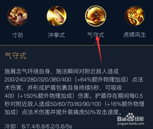 裴擒虎的2技术“气守式”是一个四周规模伤敌及对自体态当作一个护盾的感化,护盾可持续时候为5秒,在持续时对四周仇敌持续危险并晋升自身50%的攻速。