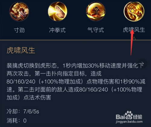 裴擒虎的2技术“虎啸刚生”是该英雄的焦点技术。可使该英雄在两种状况下切换。在虎外形态下,增添自身30%移速,第一次补中对仇敌危险并使对方1秒内减速90%,第二次击中对方,在本来危险根本上额外100%物理加当作危险。