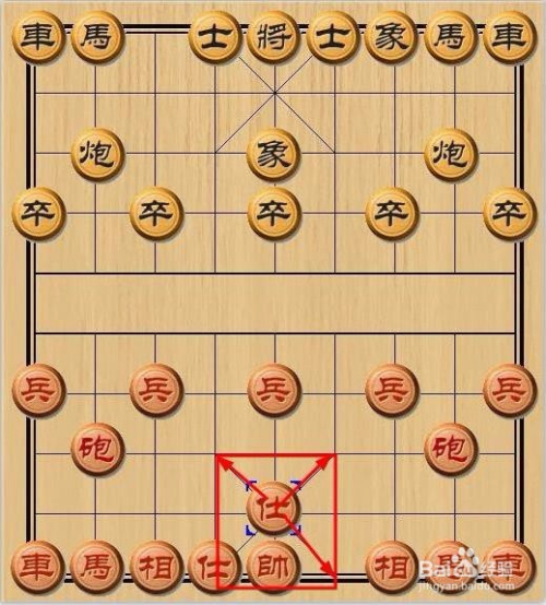仕(士) 仕(士)是将(帅)的贴身保镖,它也只能在九宫内走动。它的行棋路径只能是九宫内的斜线