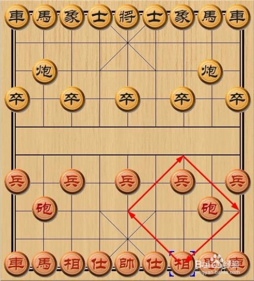 红方为“相”,黑方为“象”。 相(象)的本家儿要感化是戍守,庇护本身的帅(将)。它的走法是每次循对角线走两格,俗称“象飞田”。相(象)的活动规模限于"河界"以内的本方阵地,不克不及过河,且若是它走的"田"字中心有一个棋子,就不克不及走,俗称“塞象眼”。