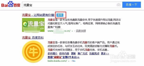 利用百度搜刮“流量宝”,找到有官网标注的网站点击进入。