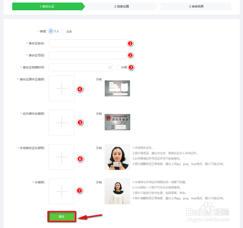 此时就进入到了身份认证页面,在页面中精确填写类型/姓名/身份证号码/身份证到期时候/身份证的正倒映/手持身份证半身照等,经细心查抄,确认无误之后,点击页面下方的【提交】。