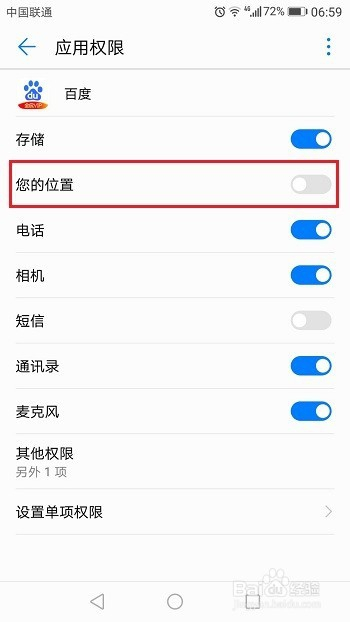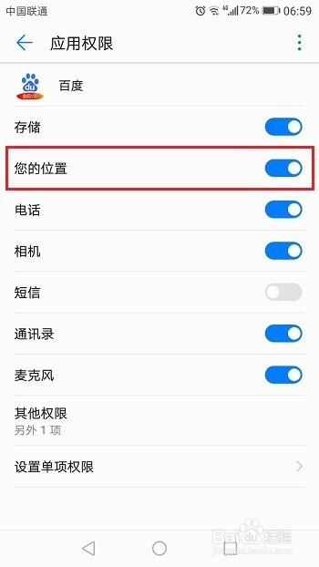 第三步进去应用办理界面之后,找到要设置位置权限的应用法式,这里选择百度,如下图所示: