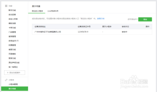 门店添加地址操作体例登录公家号后台,在左侧导航栏找到小法式的展示场景,进入“四周的小法式”,开通功能后,添加地址。