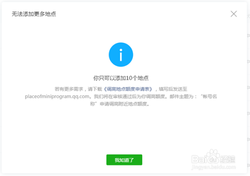 如呈现已达到上限的提醒,请按照页面提醒点击下载《调高地址额度申请表》,填写后发送至placeofminiprogram@qq.com。我们将在审核经由过程后为你调高额度。