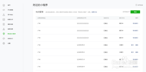注:在小法式后台添加地址审核经由过程后,无需操作,小法式将主动在该地址展示。若要遏制展示,可操作“打消展示”。