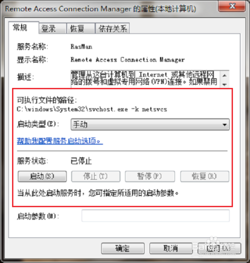 第三步进去“Remote Access Connection Manager”办事属性界面之后,可以看到办事已经遏制了,启动类型为手动,如下图所示: