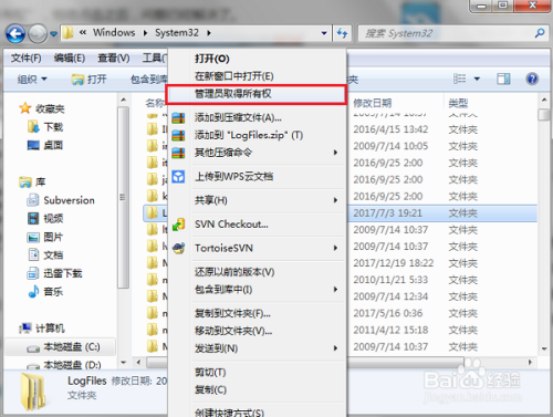 第六步鼠标右键“LogFiles”文件夹,选择办理员取得所有权,再次进行宽带毗连就不呈现711错误了,如下图所示: