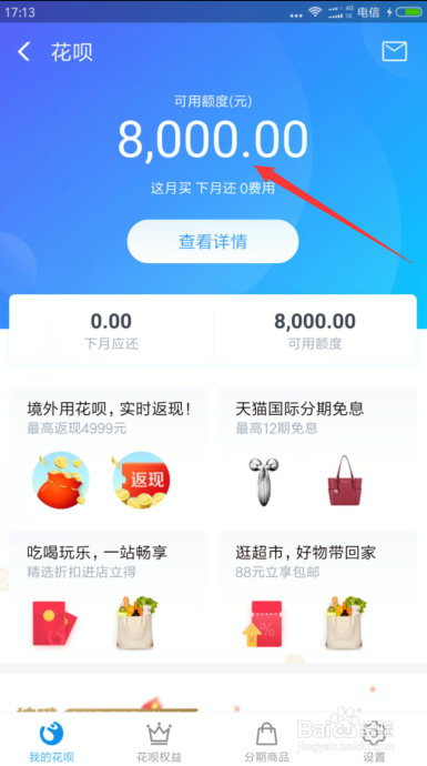点击花呗进去,申请额度,额度看小我利用付出宝或者淘宝的诺言而开通