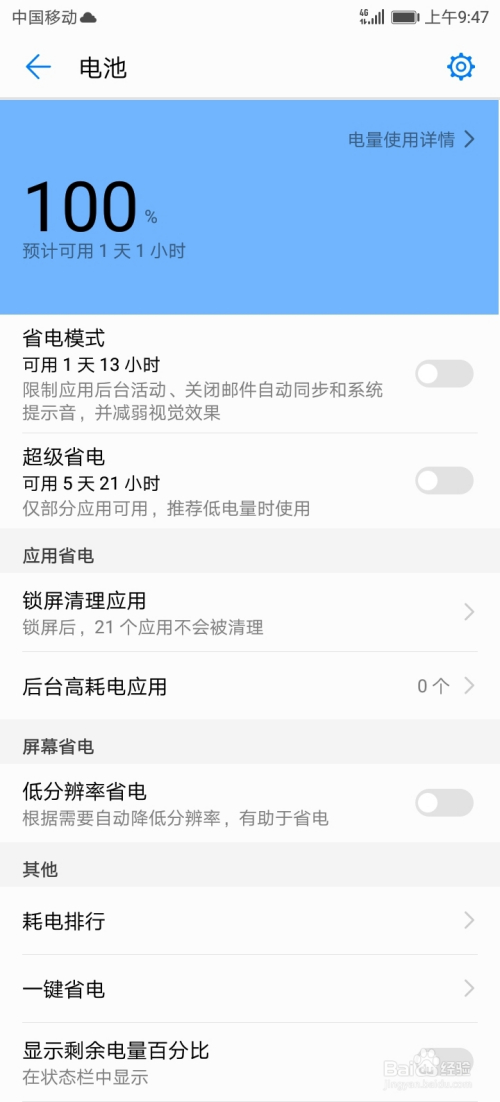 第四步:设置->电池->其他->耗电排行/一键省电(按照系统提醒封闭不需要的app达到省电目标)/显示电量百分比(在状况栏中显示)