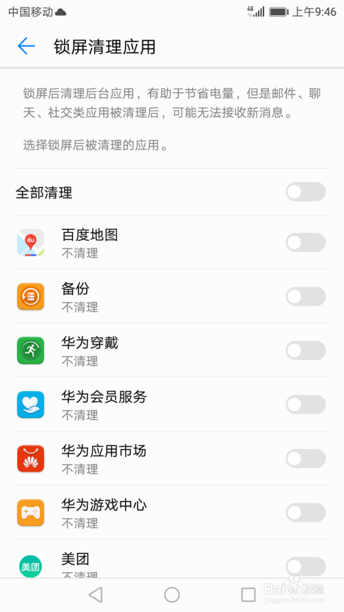 锁屏清理应用功能在锁屏后清理后台应用,有助于节流电量,可是邮件、聊天、社交类应用被清理后,可能无法接收新动静;后台高耗电应用可以一键竣事。
