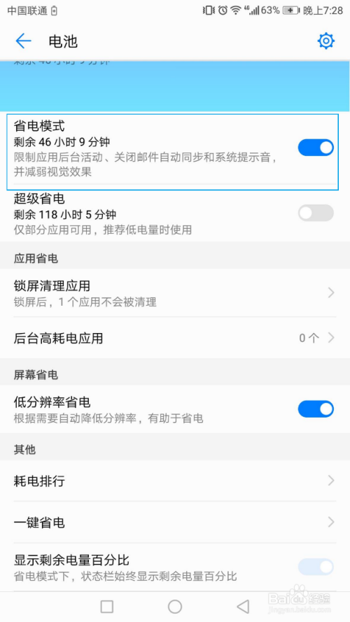 在【电池】界面,选择【省电模式】,低电量前提下选择【超等省电】。