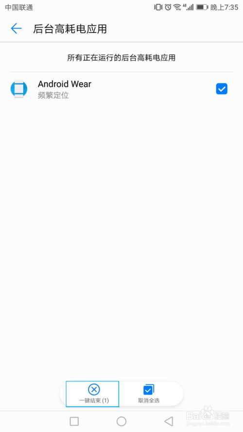 清理后台高耗电应用在【电池】界面,进入【后台高耗电应用】界面,可以快速显示正在运行的耗电应用(自前次充电后),选择【全选】按钮,点击【一键竣事】即可当即竣事后台耗电应用。