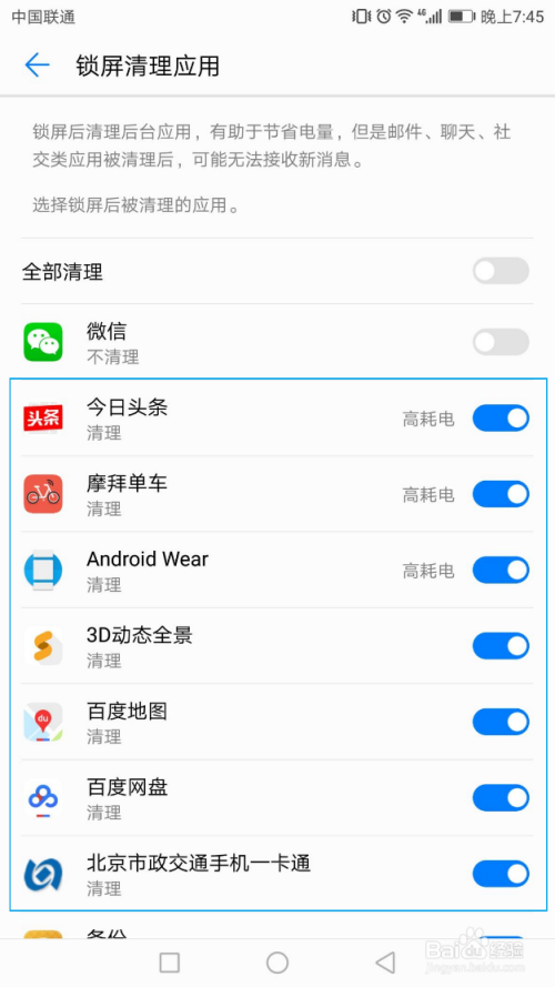 在【电池】界面,进入【锁屏清理应用】界面,那些不常用的应用通通选择清理。