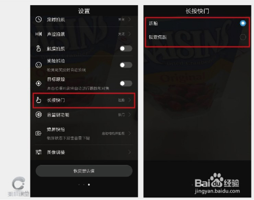 在默认状况下,在相机拍摄界面长按快门可起头连拍。您也可以将它设定为对焦功能。