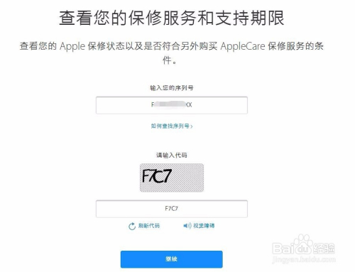 然后在东西查询页面输入我们在经验第三步查到的苹果手机的序列号,如图,输入序列号完当作后,输入验证码,再点击继续。