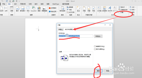 单击对象后,弹出对话框,选择由文件中建立,选择文件后,选中后,单击确定插入。