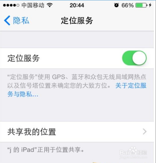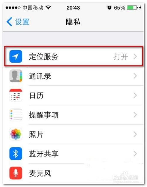 跳转到隐私选项界面选择定位办事,将定位办事封闭。如下图所示:
