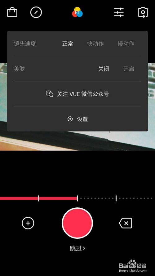 VUE视频拍摄的过程中有良多的特效,点击中上方的红黄蓝圈圈,即可进行选择。