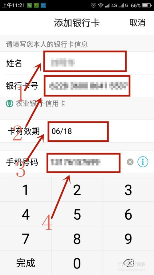 输入姓名和本人的银行卡号码,信用卡需要填写信用卡的信息、手机号码