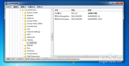 依次进入“HKEY-CURRENT-USER——Software——Microsoft——Windows——CurrentVersion——policies——Explorer”