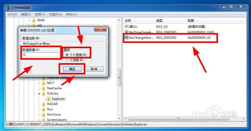 将新建值重定名为“NoChangeStartMenu”在“数值数据”中输入“1”;