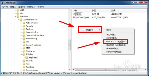 在Explorer选项,右边空白处新建“DWORD (32-位)值(D)”