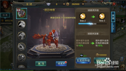 骑乘术越高,我们的能力越强,我们退出之后,点击一下主动战斗上方的阿谁按钮,就会主动下坐骑,下坐骑有cd的哦,2秒钟之后才可以从头上坐骑。