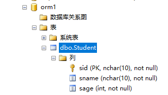 新建数据库,打开 SqlServer数据库,新建数据库 orm1,并新建表 student ,如下图所示: