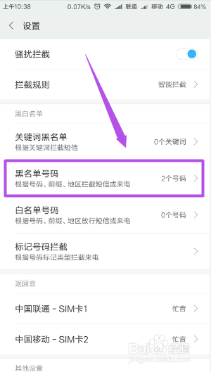 回到适才的页面,点击‘黑名单号码’,在打开的中点击‘添加’然后按照需要来输入黑名单号码或者是开首号码匹配、按地域阻挡等等。