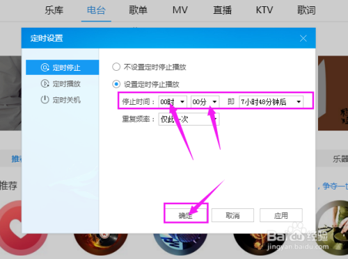 选择遏制时候后,点击【确定】。设置就会生效。【反复频率】我们可以按照需要选择,若是是固定的听歌时候,则可以选择每日。