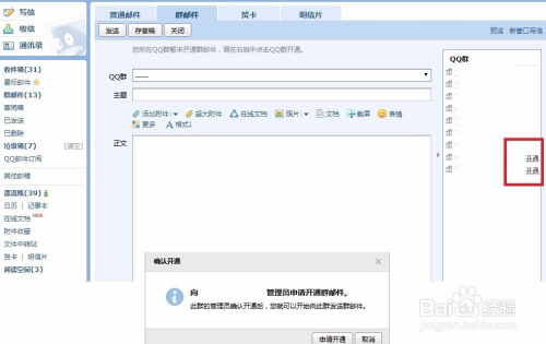 若是没有开通QQ群邮箱,若是你有权限可以登录之后,点击右侧的群邮箱目次,点击开通,若是没有权限可以点击QQ群——申请开通,就可提醒办理员开通了。如许就可以正常发群邮箱了。
