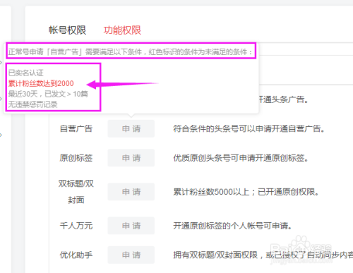 找到【自营告白】,把鼠标移动到“申请”上我们就能看到前提,此中一个对于没有根底的新账号来说仍是有点难度的,就是粉丝2000.