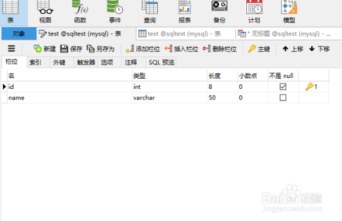 第一步,建立测试表。首先在数据库中新建一张测试表,字段包罗id(int、自增)、name(varchar),如下图所示: