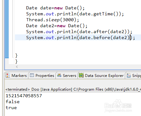 date类的方式介绍,如 getTime获取毫秒数的时候,before(Date date),after(Date date)方式返回boolean型数据,判定日期是在指定日期前仍是指定日期后。还有其他获取小时分钟等等的方式 代码如图