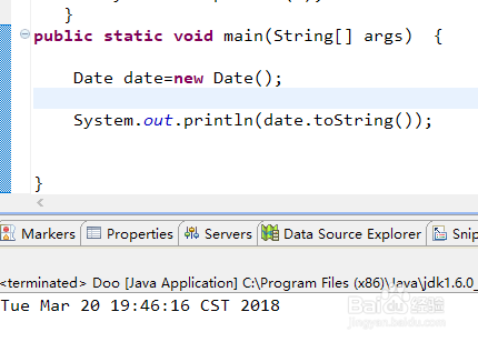 经由过程java.util的date类来获取时候,先初始化一个date对象,在挪用他的string方式我就就能输出当前的时候。代码如图
