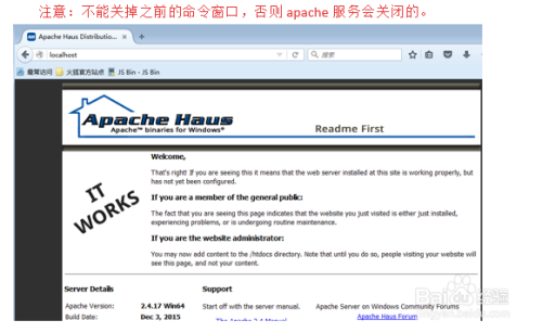 测试。你可以把Apache24\htdocs目次下的index.html放到\www目次下,用浏览器127.0.0.1拜候会呈现“It works”那么就申明apache已经准确安装了。若是在号令行呈现问题提醒,可能是80端口被其他法式占用。若是是拜候403,请参考上面第2步“设置装备摆设apache办事器”逐个查对。