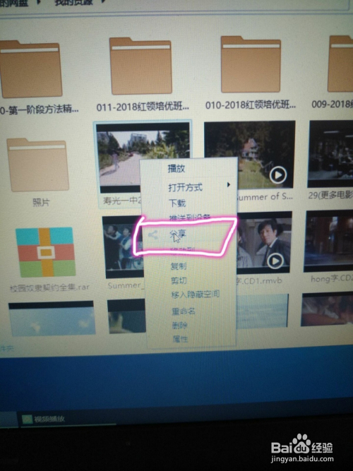 右击需要分享的视频,会呈现功能列表,包罗分享、下载、上传等各类操作,我们需要点击右键分享视频进入分享界面。