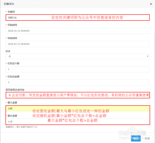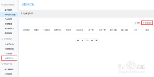 进入功能办理平台 - 红包活动 - 关头词红包 - 新建活动;
