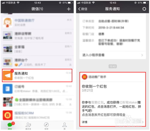 用户点击超链接“点此领取”,微信会同步将红包以“办事通知”的形式推送给用户领取。